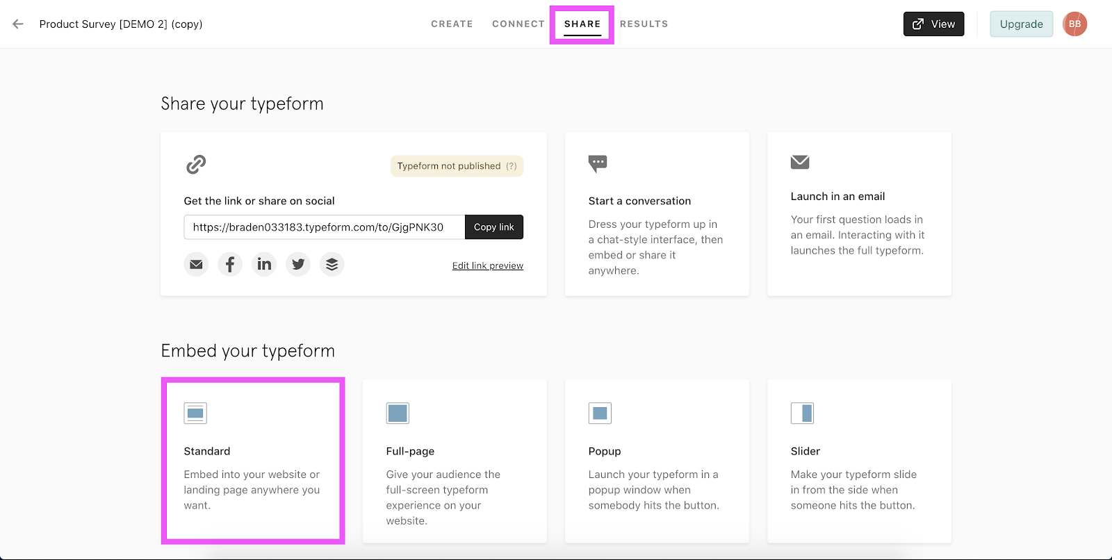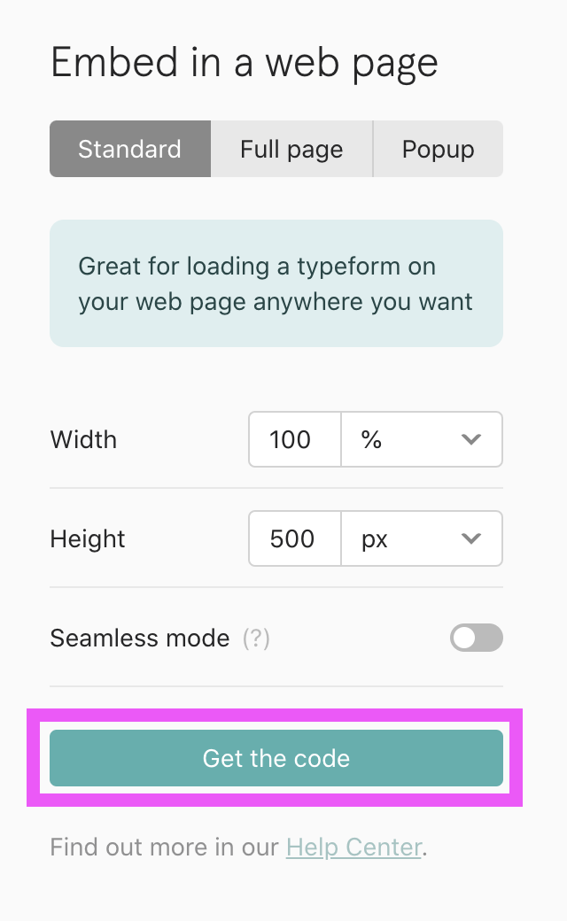 - Select the Standard format from Embed your Typeform section.