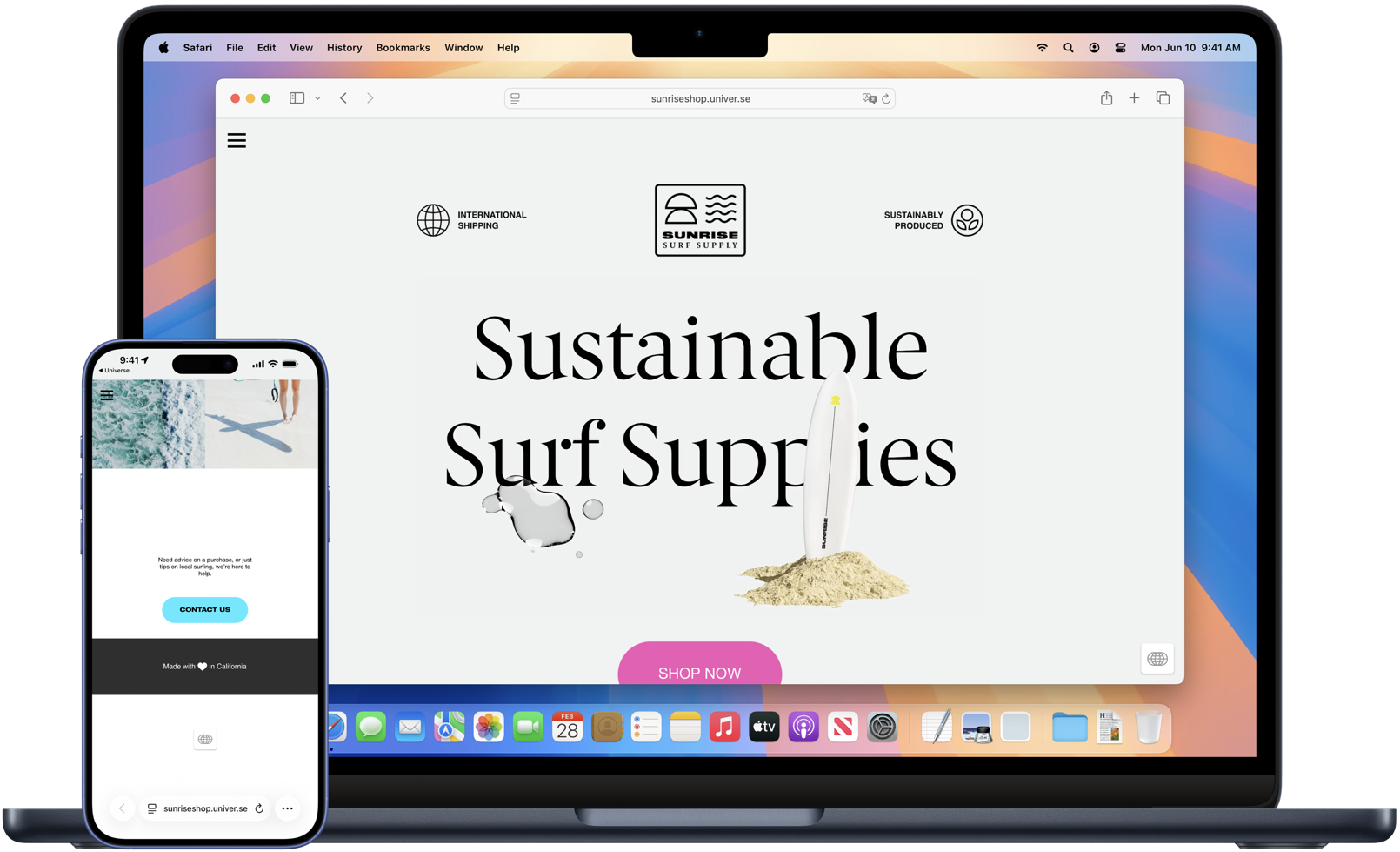 The Universe Sticker is a small badge representing Universe that appears at the bottom of your website. We think of it as a badge of authenticity that gives your website credibility by letting people know this is a customer website built by hand on Universe. On mobile it appears at the very bottom of your website when scrolling. On desktop it appears in the bottom right corner floating.